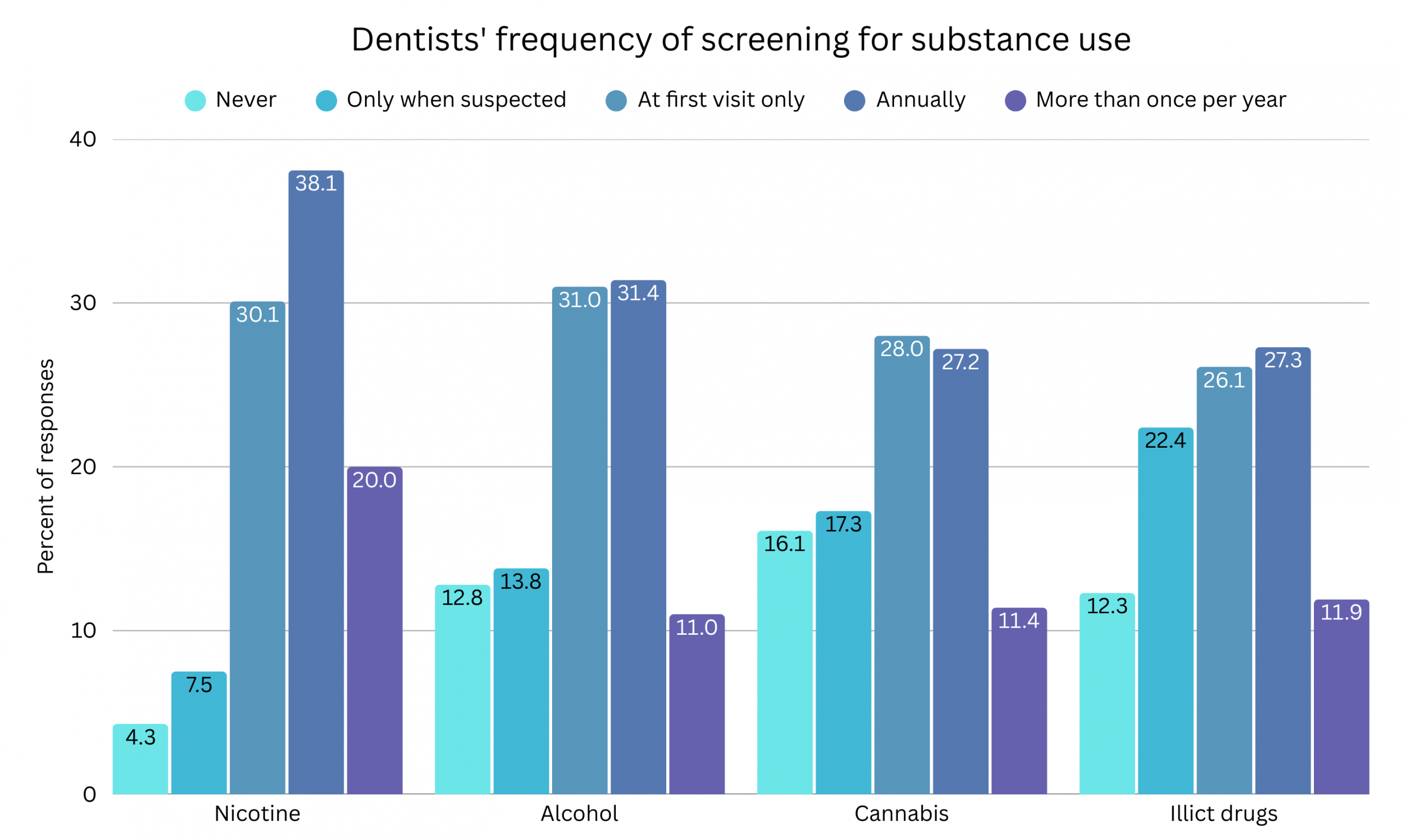 Figure. Frequency of screening for nicotine, alcohol, cannabis, and illicit drug use among dentists, as reported in McCauley et al. (2026).