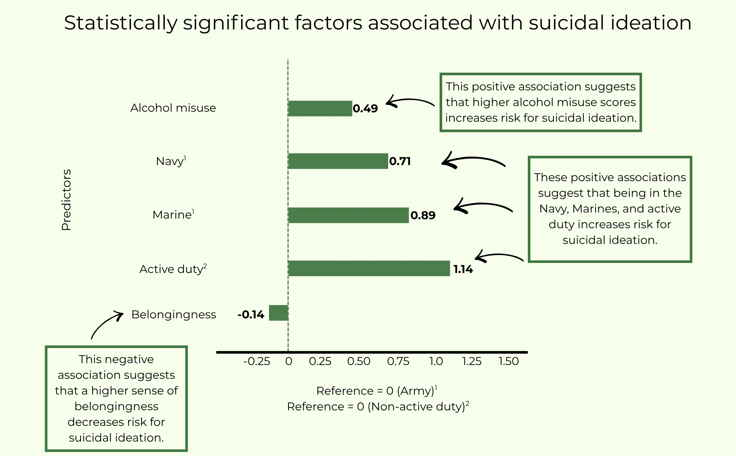 Figure. Represents statistically significant linear regression effects. There was a positive association between alcohol misuse and suicidal ideation and a negative association between belongingness and suicidal ideation. Higher rates of suicidal ideation existed for Navy and Marines, compared to Army, and for active duty members, compared to non-active duty members. Click image to enlarge.